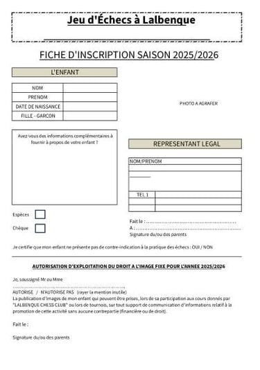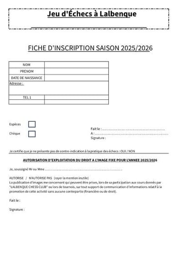 Document à remplir et à nous remettre le mercredi au club, ou à scanner et à nous adresser par courriel en cliquant ici